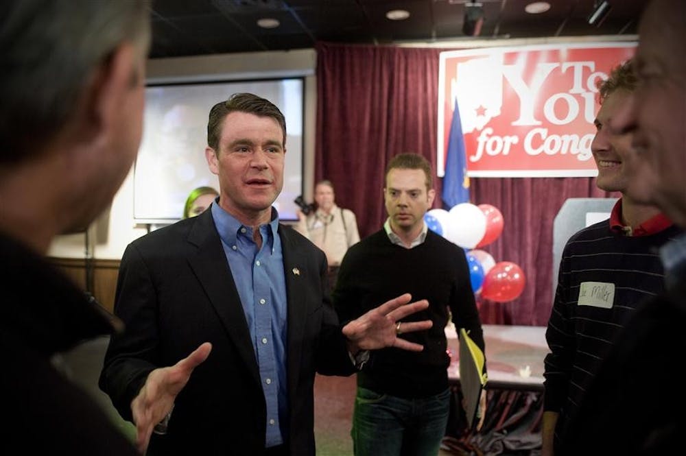 Representative-elect Todd Young, R-9th, speaks with supporters at a victory party Tuesday at KRC Catering in Bloomington.