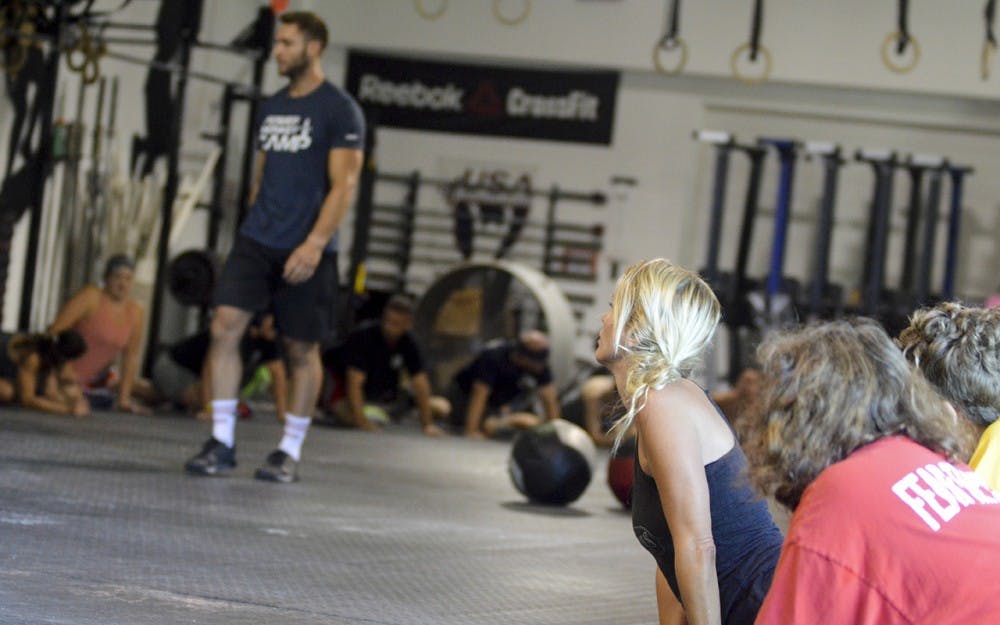 Hoosier Crossfit owner Shaun Tieman guides Blooimington residents, students, and officers through intense workouts during the crossfit with a cop event Saturday morning. Officers from both the Bloomington Police Department and the Indiana University Police Department came out to bond with citizens and IU students through intensive crossfit exercises.