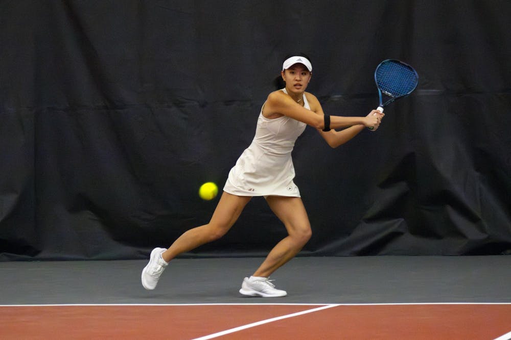 Indiana junior Li Hsin Lin looks toward the ball during the match against the University of Cincinnati on Jan. 31, 2026, at the IU Tennis Center in Bloomington. Lin won her singles match in two sets.