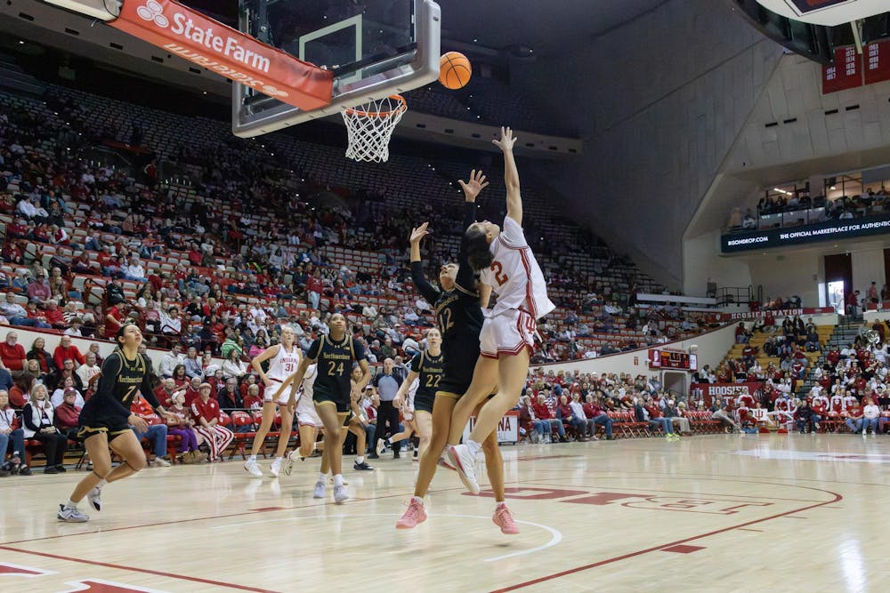 Freshman guard Nevaeh Caffey attempts a layup during the game against Northwestern on Feb. 1, 2026, at Simon Skjodt Assembly Hall in Bloomington. Caffey had seven points in the game. Chloe LaVelle