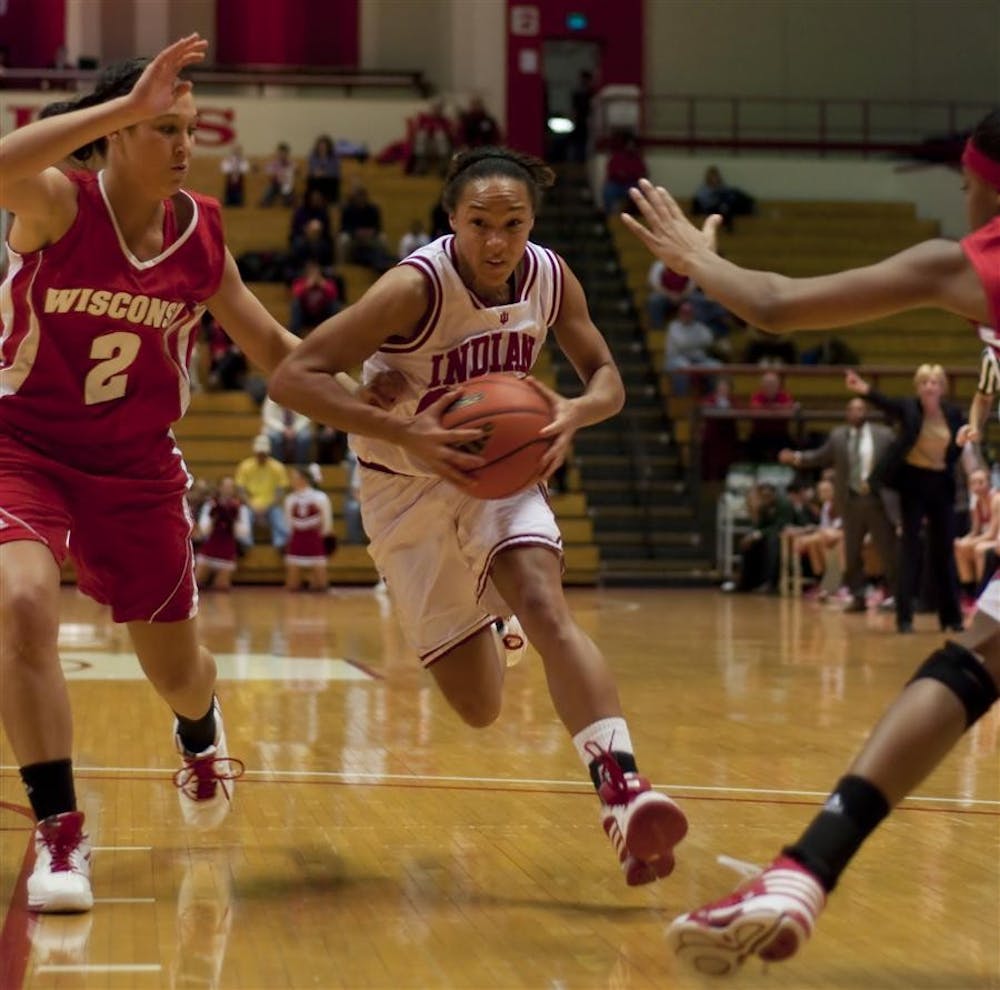 Junior guard Whitney Lindsay drives through Wisconsin defenders during the Hoosiers' 55-47 loss to the Badgers Jan. 28 at Assembly Hall. Peter Stevenson
