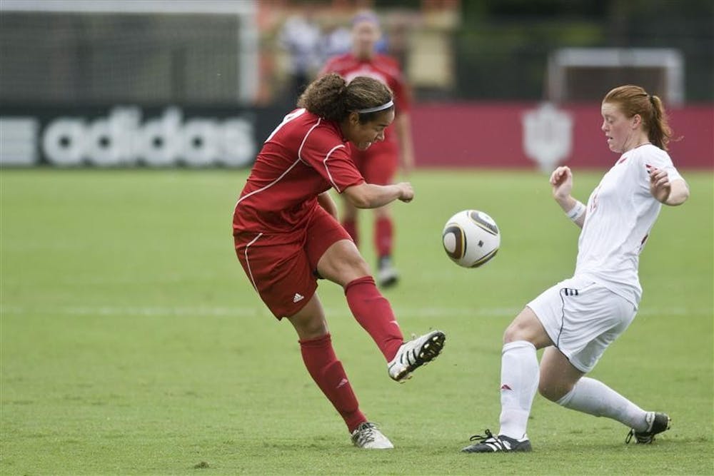 Sophomore forward Orianica Velasquez takes a long-range shot during IU's 1-0 overtime loss to Wisconsin on Sunday at Bill Armstrong Stadium. Peter Stevenson