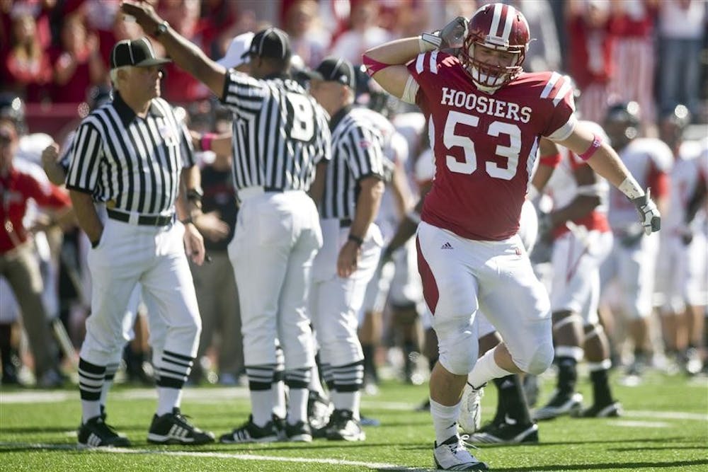 Junior linebacker Jeff Thomas reacts as referees signal a recovered fumble for IU during the Hoosiers' 36-34 win against Arkansas State on Saturday at Memorial Stadium. Peter Stevenson
