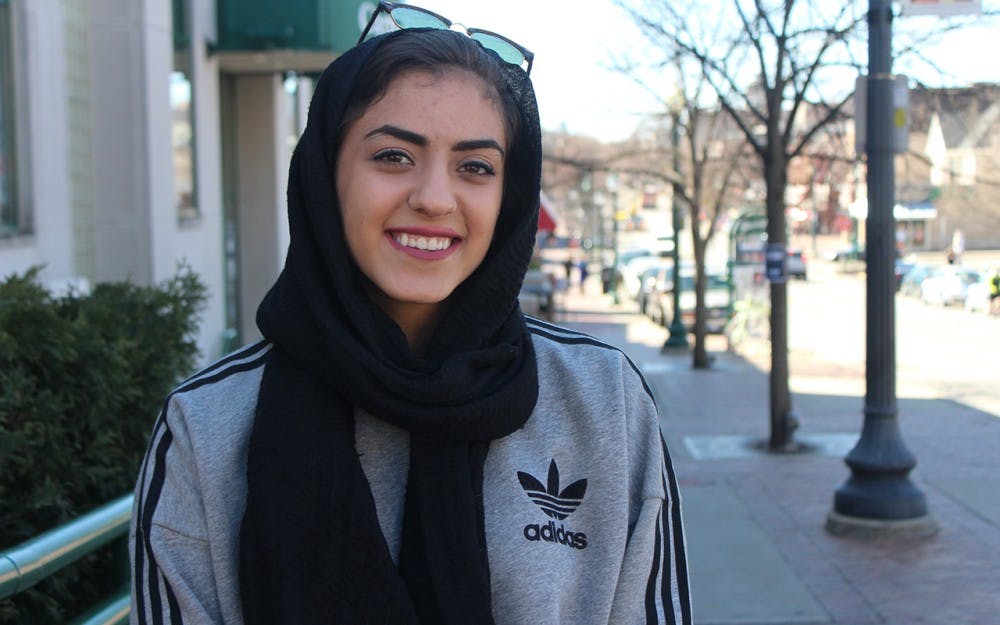 Reem Alturki walks down Kirkwood Avenue Wednesday wearing her hijab. She explains how she is just like all of the other students walking around. The only difference is that she prefers to wear an extra piece of clothing.