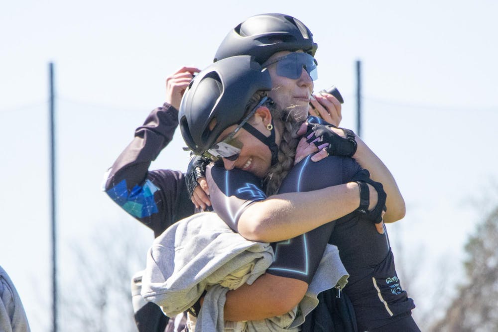 Cyclists for Christian Student Fellowship hug during qualifications for the Little 500 on March 28, 2026, at Bill Armstrong Stadium in Bloomington. The CSF women's team finished 6th in the qualifying race.