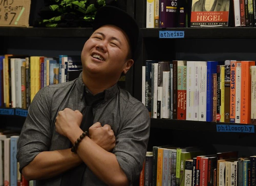 Spoken word artist Kit Yan gestures while performing poetry Thursday at Boxcar Books. Yan is on Campus Pride's Top 25 LGBT college campus speakers list. Steph Langan