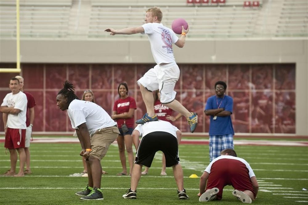 Members of the white team found creative ways to combat the red team during IU's attempt at breaking the record for the world's largest dodgeball tournament Sunday at Memorial Stadium. Peter Stevenson