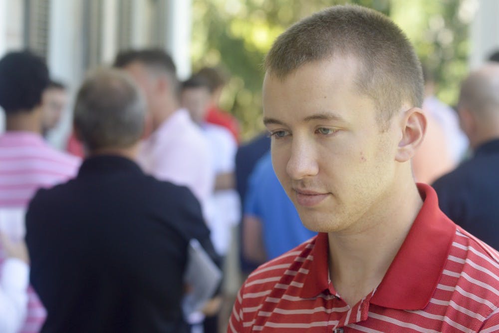 Acacia Graduate Supervisor Drew Sherman speaks on moving the fraternity forward Sunday afternoon at the Acacia Crest unveiling. The fraternity brought together past and present as alumni and new brothers reclaimed their house from Phi Sigma Kappa.