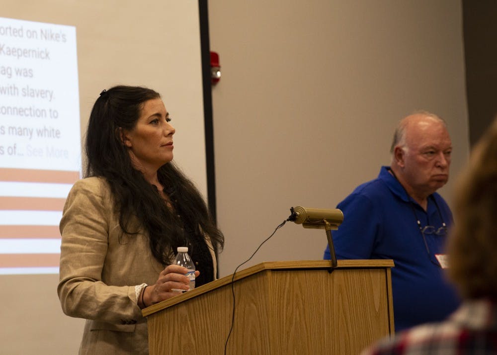 Sarah Dye, one of the owners of Schooner Creek Farm, speaks during a Grassroots Conservatives meeting Sept. 26 in the Ellettsville Branch of the Monroe County Public Library. Dye was invited to speak about her experience dealing with the backlash of being a member of the American Identity Movement, which is an active movement defending the United States against mass immigration and globalism, according to the movement’s website.