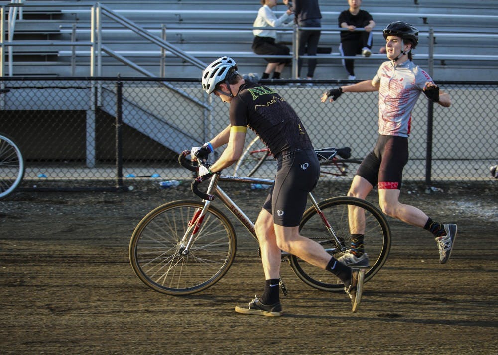 A member of Lambda Chi Alpha grabs the bike from his team member to continue Little 500 practice Thursday, April 12, at Bill Armstrong Stadium. Riders completed 50 laps to practice for Little 500 on April 20 and 21.