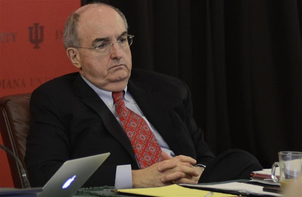 President Michael McRobbie sits at the Board of Trustees meeting Thursday in the Frangipani Room of the Indiana Memorial Union.