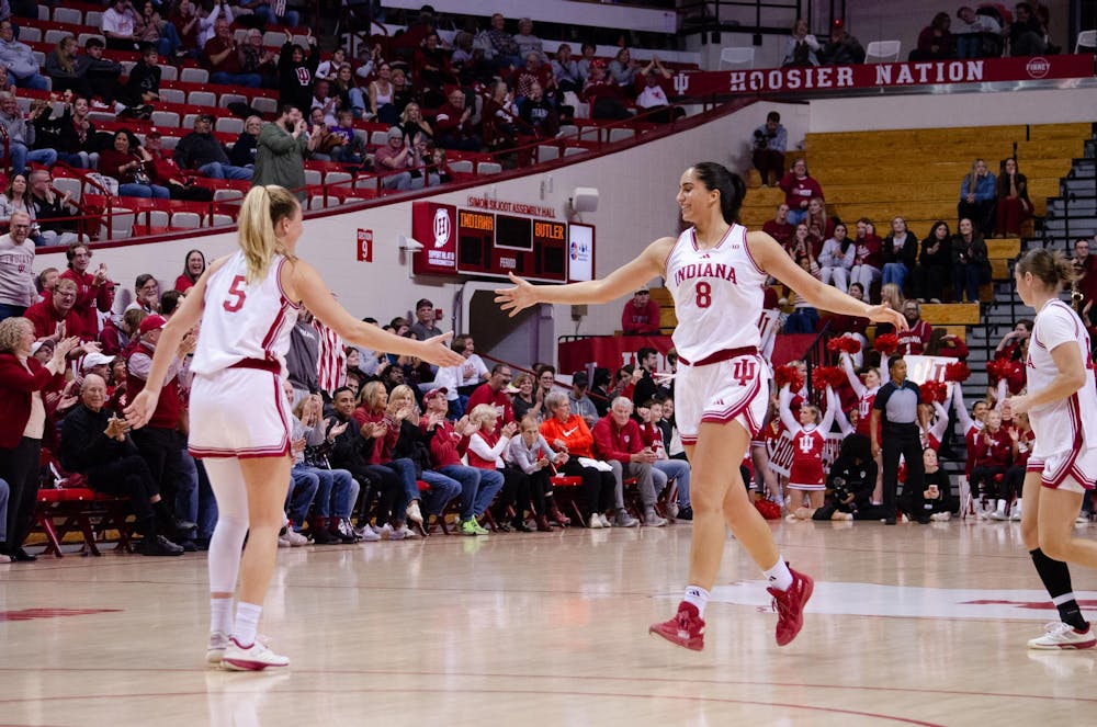 Redshirt sophomore Lenée Beaumont (left) and junior forward Edessa Noyan (right) high five after scoring against Butler University on Nov. 19, 2025, inside Simon Skjodt Assembly Hall in Bloomington. The Hoosiers lost their first game of the season Sunday against Iowa State University.