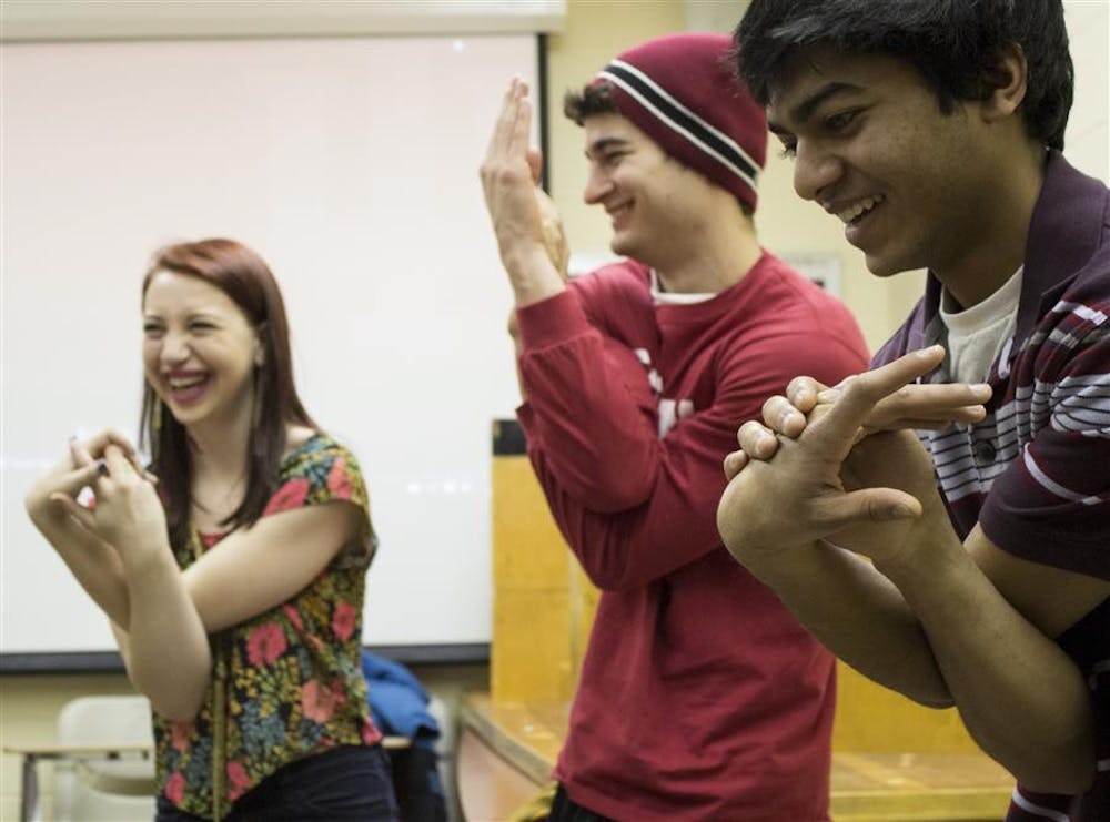 Freshmen Cody Gage, Cloe Pippin and Anuj Khemka participate in a "Hindi through Yoga" class during the third World Language Festival. The event, which took place all-day Saturday at Ballantine Hall, was organized by the Center for Language Technology and Instructional Enrichment. The event was organized to celebrate diverse cultures and showcase IU's renowned language instruction program.