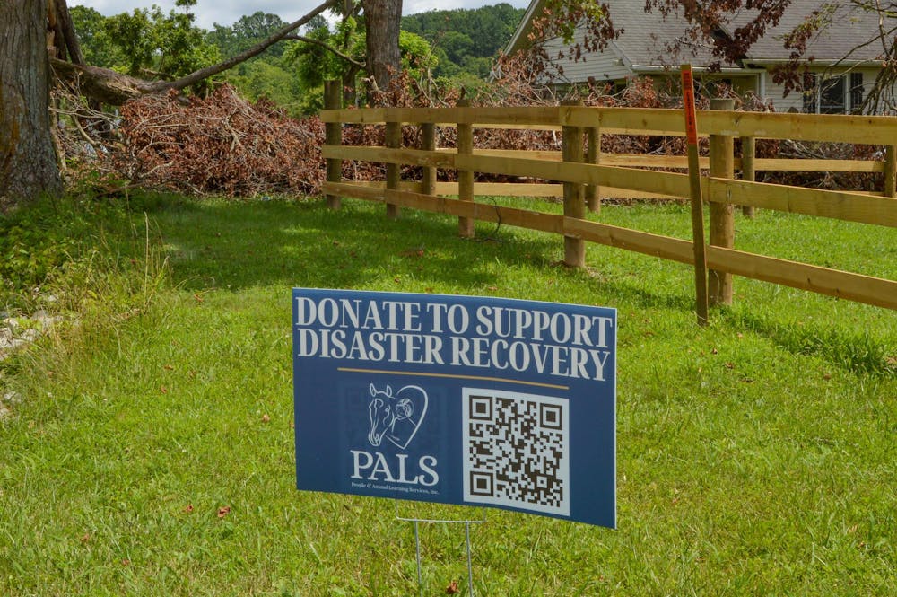 A sign encourages people to donate to People and Animals Learning Services’s recovery efforts in front of a storm-damaged building July 21, 2025. PALS was hit by an EF2 tornado in May 2025.