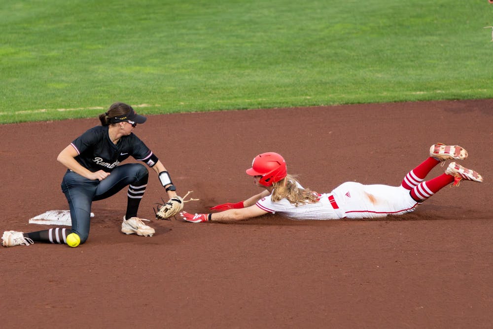 Junior short stop Alex Cooper slides into second base during the game against Loyola Chicago on March 10, 2026, at Andy Mohr Field in Bloomington. Cooper scored three runs in the game. Katie Newett
