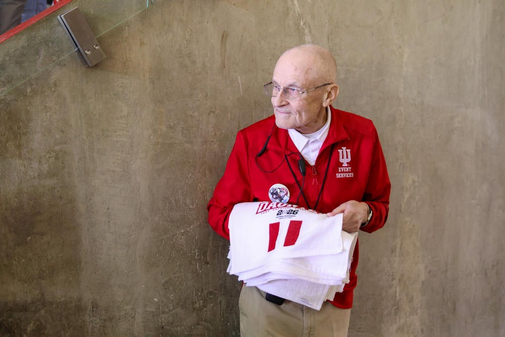 Event services employee Bob Price waits to hand out College Football Playoff championship game rally towels to IU students and fans on Jan. 19, 2026, in Simon Skjodt Assembly Hall in Bloomington. Price has worked part-time for IU Events Services for the last six years.
