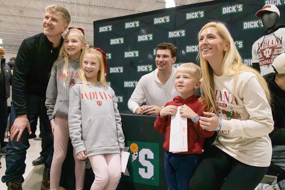 A family gets their photo taken with Fernando Mendoza at his meet and greet Jan. 21, 2026, at Dick’s Sporting Goods in Bloomington. Several fans drew pictures, wrote notes or gave small gifts to Mendoza. Chloe LaVelle