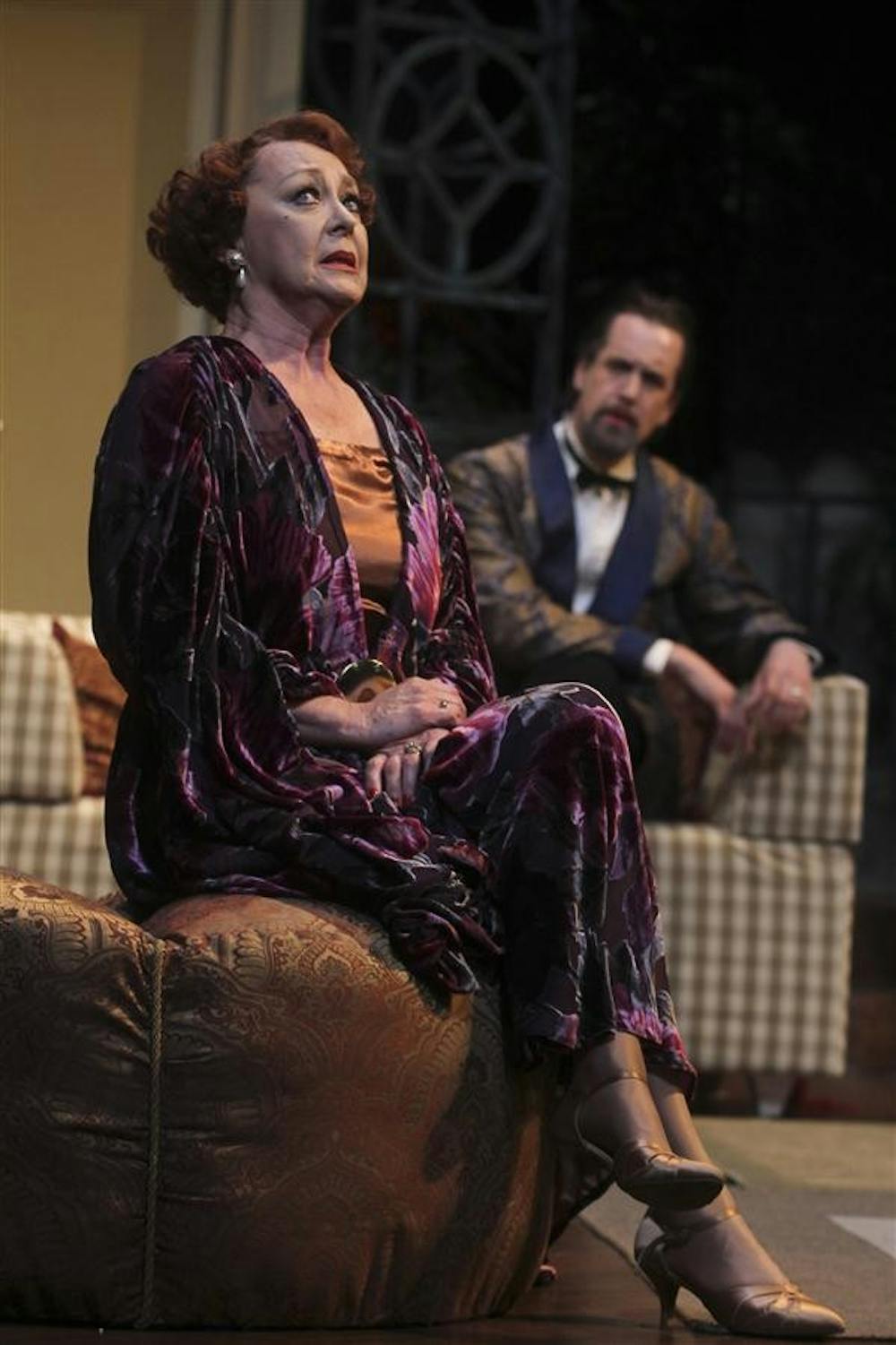 Performing during dress rehearsals for Hay Fever, professional British actress Sandra Duncan plays central role Judith Bliss as Henry A. McDaniel III watches as David Bliss on Monday at the Ruth N. Hall Theatre. The comedy is directed by associate professor of acting Murray McGibbon.