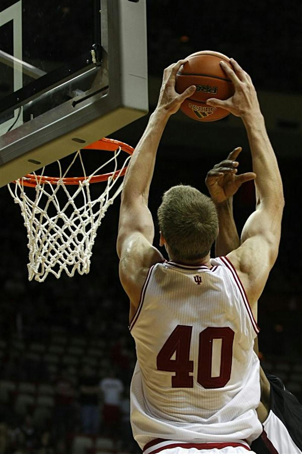 Freshman forward Cody Zeller slams in a two handed dunk over a University of Indianapolis player Saturday at Assembly Hall. Mark Felix