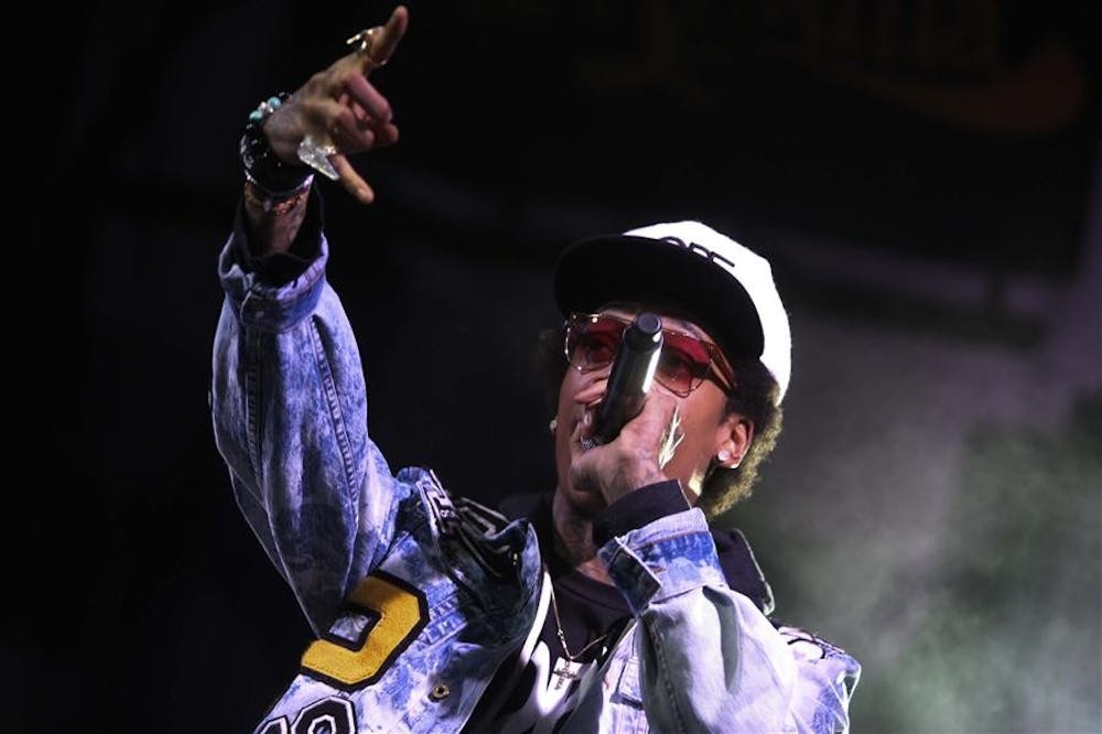 Wiz Khalifa addresses the crowd Friday in the Zeta Beta Tau parking lot. Mark Felix
