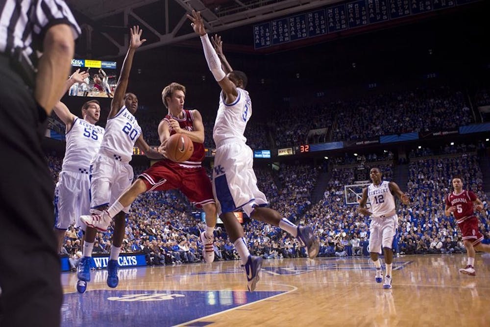 Sophomore guard Jordan Hulls looks to pass out of trouble during IU's 81-62 loss to Kentucky on Dec. 11 at Rupp Arena in Lexington, Ky.