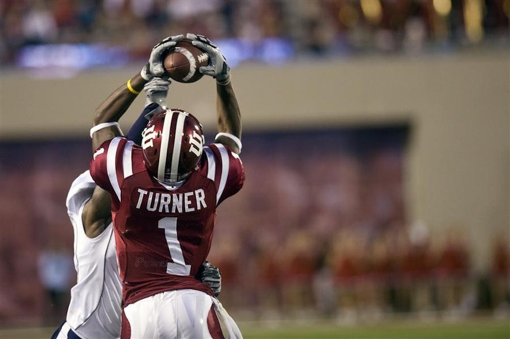 Senior wide receiver Terrance Turner catches a pass during IU's 35-20 win against Akron on Saturday at Memorial Stadium.