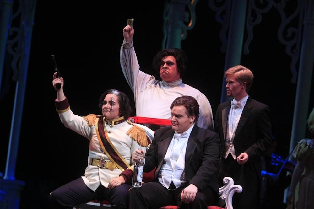 After playing Russian roulette with masters student Blake Kendall, senior Kelly Glyptis salutes the audience with her handgun while her cohort shows off his money on Tuesday at the Musical Arts Center. Die Fledermaus was originally writte by Johann Strauss.