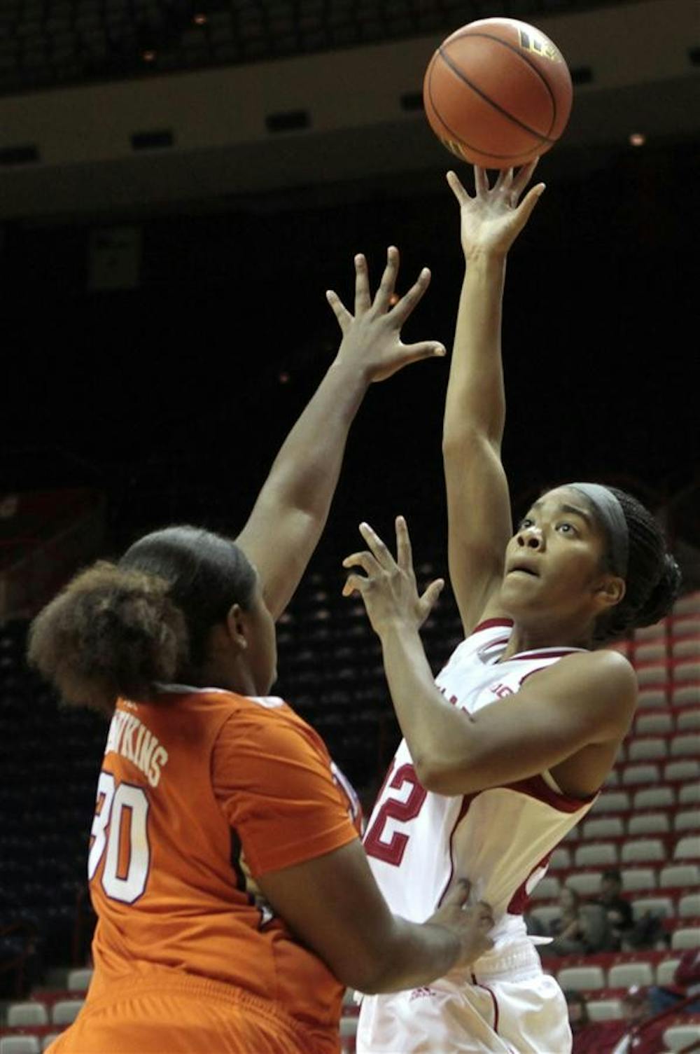 Sasha Chaplin shots a hook shot over a defender Wednesday against Clemson at Assembly Hall. Mark Felix