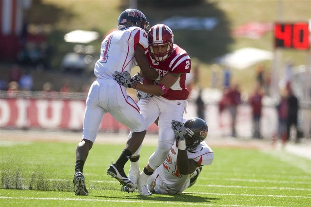 Wide receiver Tandon Doss is tackled by Arkansas State defenders Carlos McCants and Kelcie McCray during the Hoosiers' game against the Red Wolves on Saturday at Memorial Stadium.