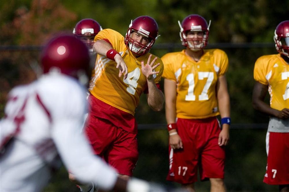Senior quarterback Ben Chappell throws as the rest of IU's quarterbacks look on during practice Aug. 25 at the IU football practice field. Peter Stevenson