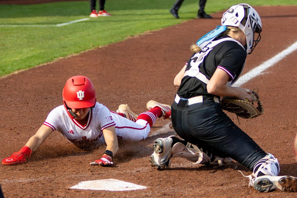 Junior second baseman Aly VanBrandt slides into home plate during the game against Loyola Chicago on March 10, 2026, at Andy Mohr Field in Bloomington. VanBrandt hit three home runs in the game. Katie Newett