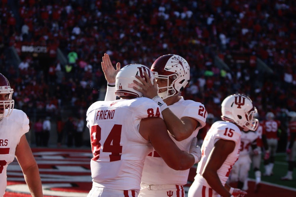 Quarterback Richard Lagow, smacks tight end Danny Friend after his pass is completed. The Hoosiers lost their second conference match up against the Buckeyes. Matt Rasnic and Matt Rasnic