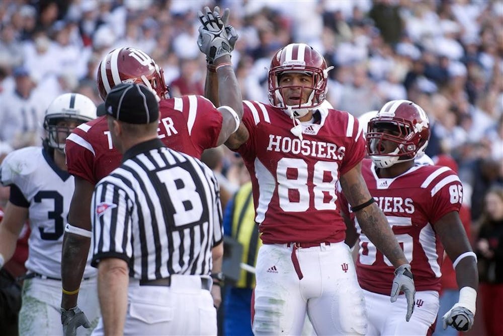Junior wide receiver Damarlo Belcher reacts after an IU touchdown during the Hoosiers' 41-24 loss to Penn State on Saturday at Fedex Field in Landover, Md.