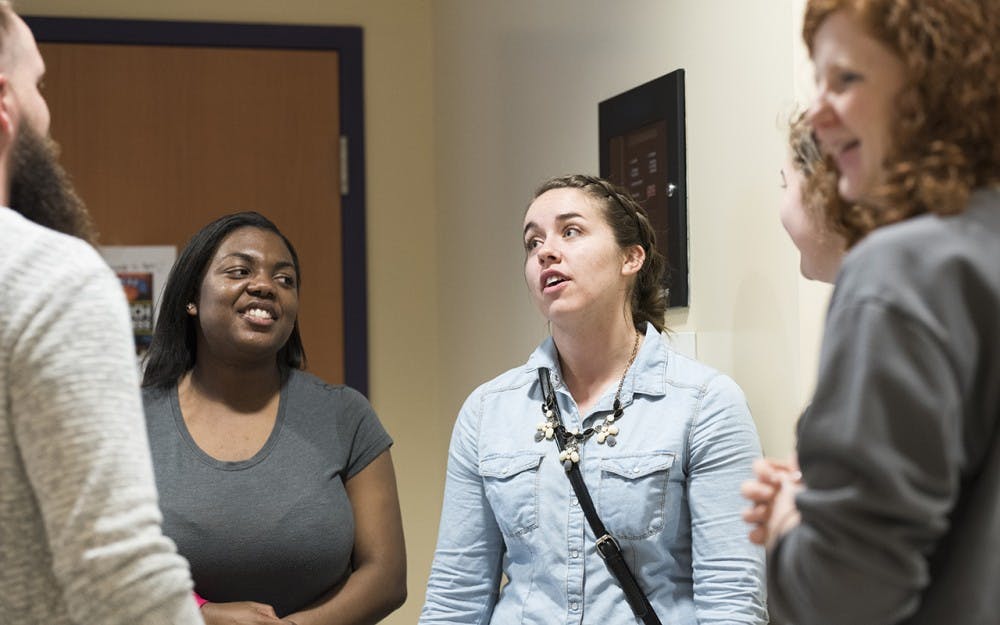Christal Burnett and Katie Acton from CRU talk to the Carry the Love event leader Graham Marshall before the event Monday night. After students mingled with their friends and leaders for the event, they filed into the Wilke Auditorium for a night of worship.