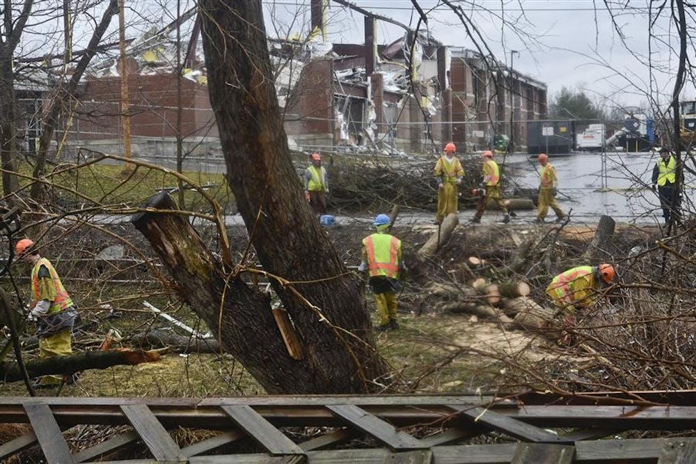 Prison inmates clear trees and brush Thursday outside of Henryville Jr./Sr. High School in Henryville, Ind.