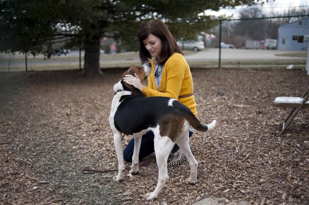 Emily Herr plays with Allanah before she takes the dog to an elementary school Saturday morning in Bloomington, Indiana. Mark Felix