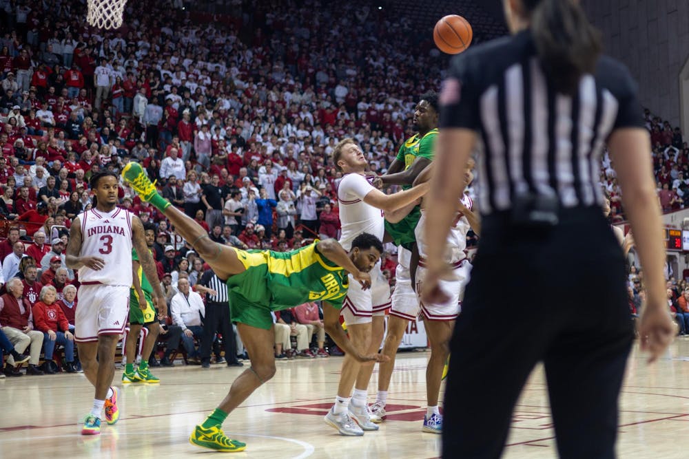 Indiana and Oregon basketball players fight for the ball during the game against Oregon on Feb. 9, 2026, at Simon Skjodt Assembly Hall in Bloomington. With the win, the Hoosiers moved to stand 8-6 in the Big Ten. Briana Pace
