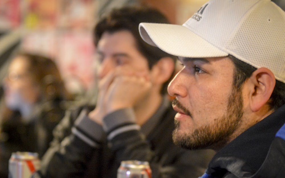 Junior Miguel Estrada and Jay Veloz state their displeasure at Donald Trump’s initial lead during the Election Day watch party on Tuesday evening at the The Back Door.