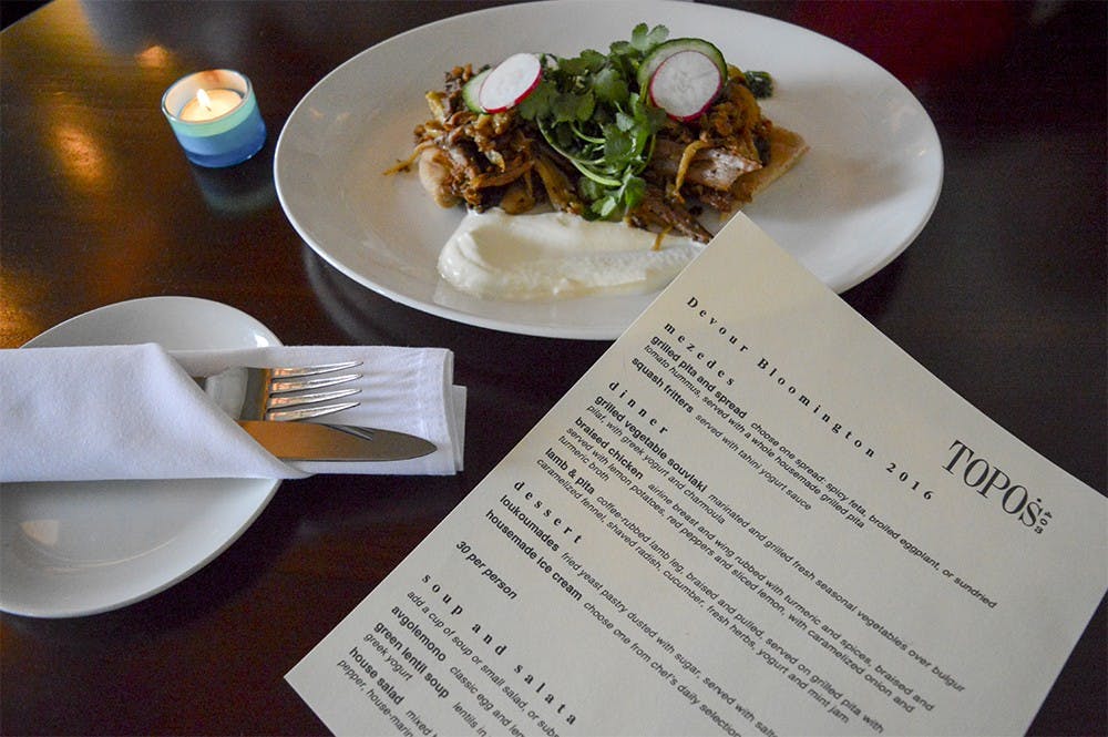Lamb & pita is displayed during the Devour Bloomington special Thursday evening at Topo’s 403 restaurant. Topo’s specializes in authentic Greek food. Andrew Williams and Andrew Williams