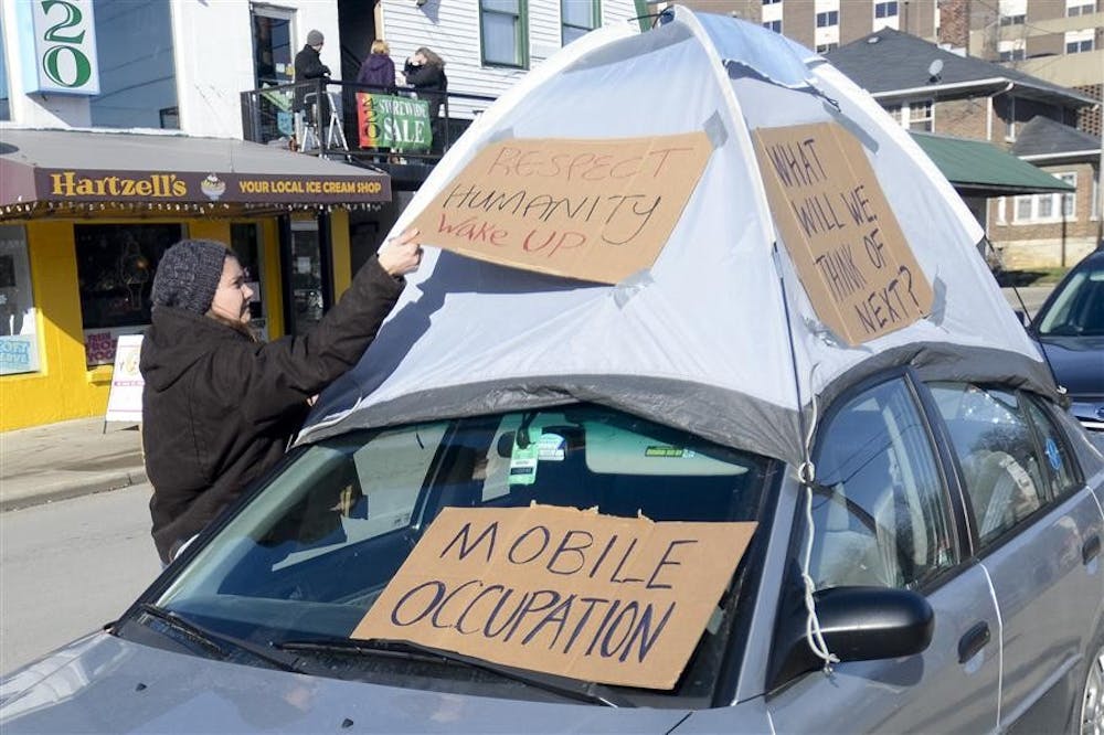 An Occupy protestor who refused to give her name places signs on a tent set up on a car Thursday near Peoples Park. Occupiers took down their tents and wrote signs on the sides of cardboard boxes. Steph Langan