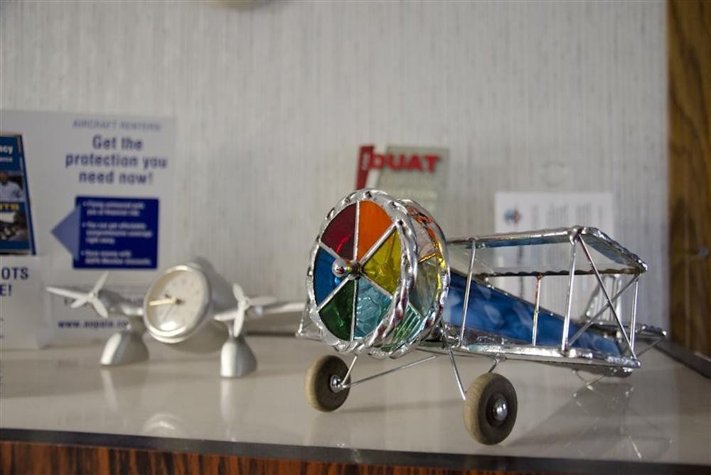 An aircraft model sits beside a clock desgned to look like an airplane atop a drawer in the BMG Aviation office. "One thing you'll notice about anyone who flies - they all have a ton of model planes," Deckard said. Amelia Chong