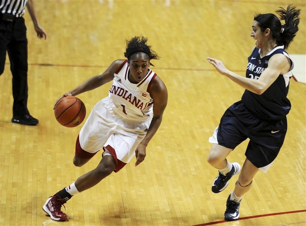 Senior guard Jasmine McGhee drives past a Penn State defender in a game against Penn State on Thursday at Assembly Hall. Hoosiers lost 76-54.