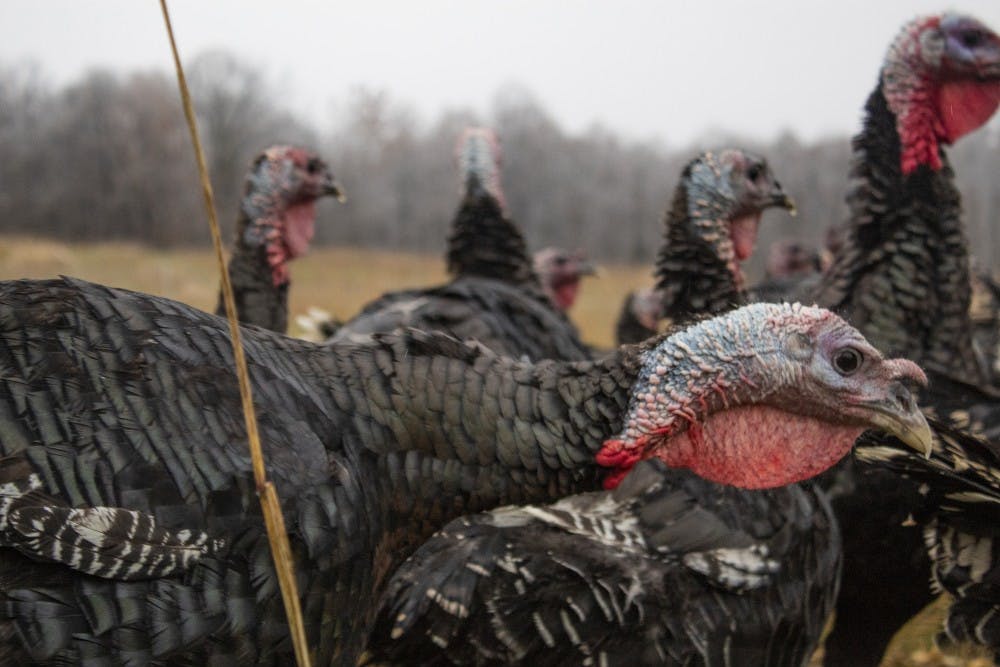 The turkeys follow Larry Howard around as he sets up their enclosure Nov. 15. The turkeys are set to be slaughtered Nov. 18 for Thanksgiving.