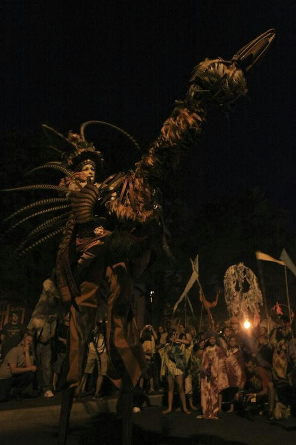 A stilt walker shows off the long neck of the costume Saturday on Kirkwood Ave.