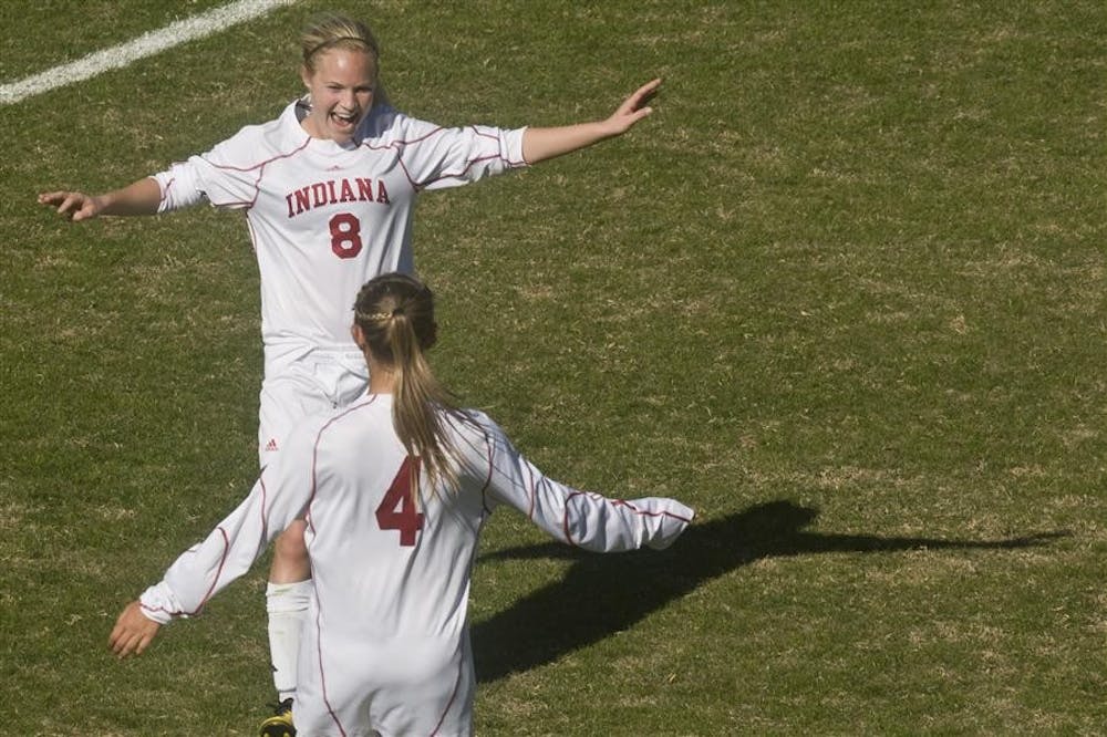 Junior midfielder Kirsta Kellin celebrates with freshman defender Lara Ross after IU's 1-0 win against Ohio State on Sunday at Bill Armstrong Stadium. Peter Stevenson