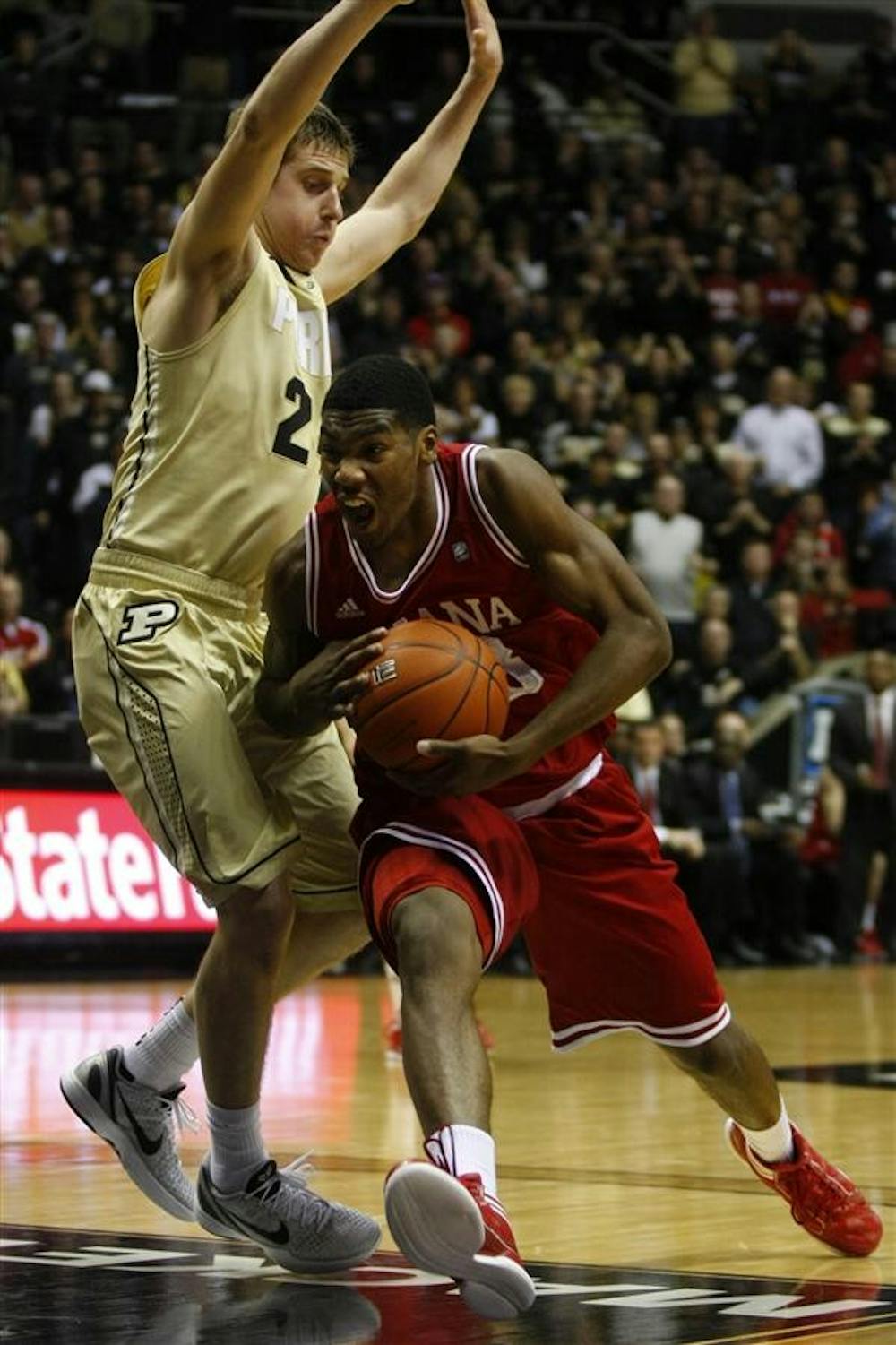 Indiana guard Remy Abell drives past a Purdue defender Saturday at Mackey Arena. Mark Felix