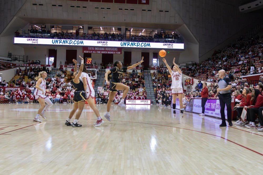 Senior guard Shay Ciezki attempts a 3-point shot during the game against Northwestern on Feb. 1, 2026, at Simon Skjodt Assembly Hall in Bloomington. Ciezki went 5-9 from 3-point range.