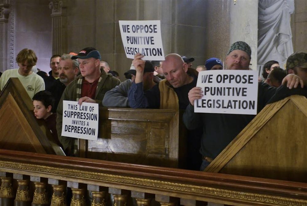 Protestors hold up posters Tuesday at the Indiana Statehouse. Chants such as "Mitch is a liar" and "No right-to-work" could be heard throughout the house. Steph Langan