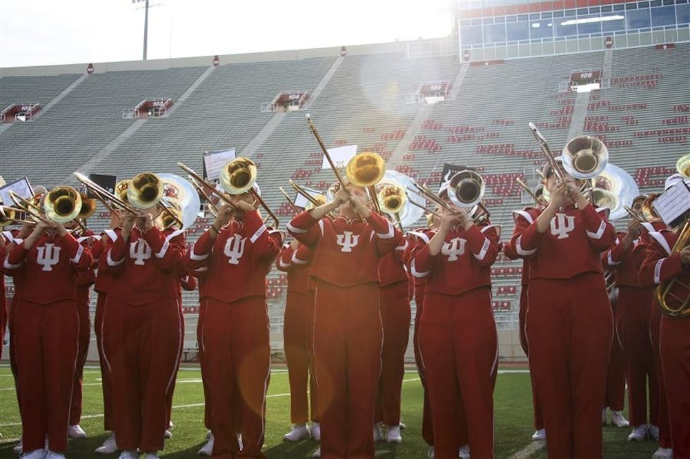 Playing with their backs to the sun, the trombones and sousaphones of the Marching Hundred play in Memorial Stadium on Thursday.