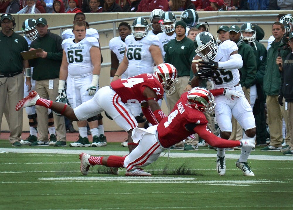Seniors Forisse Hardin and Tim Bennett make a tackle in IU's homecoming game against Michigan State on Saturday at Memorial Stadium.